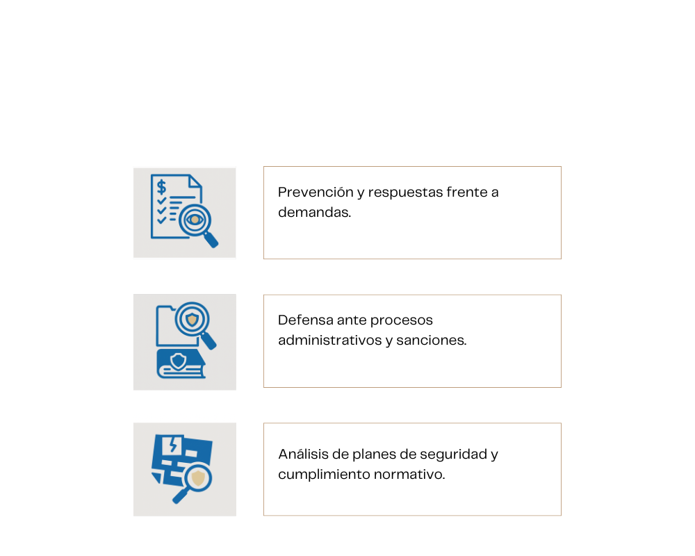 Ofrecemos representación legal y asesoría técnica especializada en litigios donde la seguridad es el eje del conflicto. Nuestro enfoque combina análisis normativo con evaluación pericial, permitiendo construir estrategias defensivas sólidas, técnicas y ajustadas a la realidad operativa del caso.